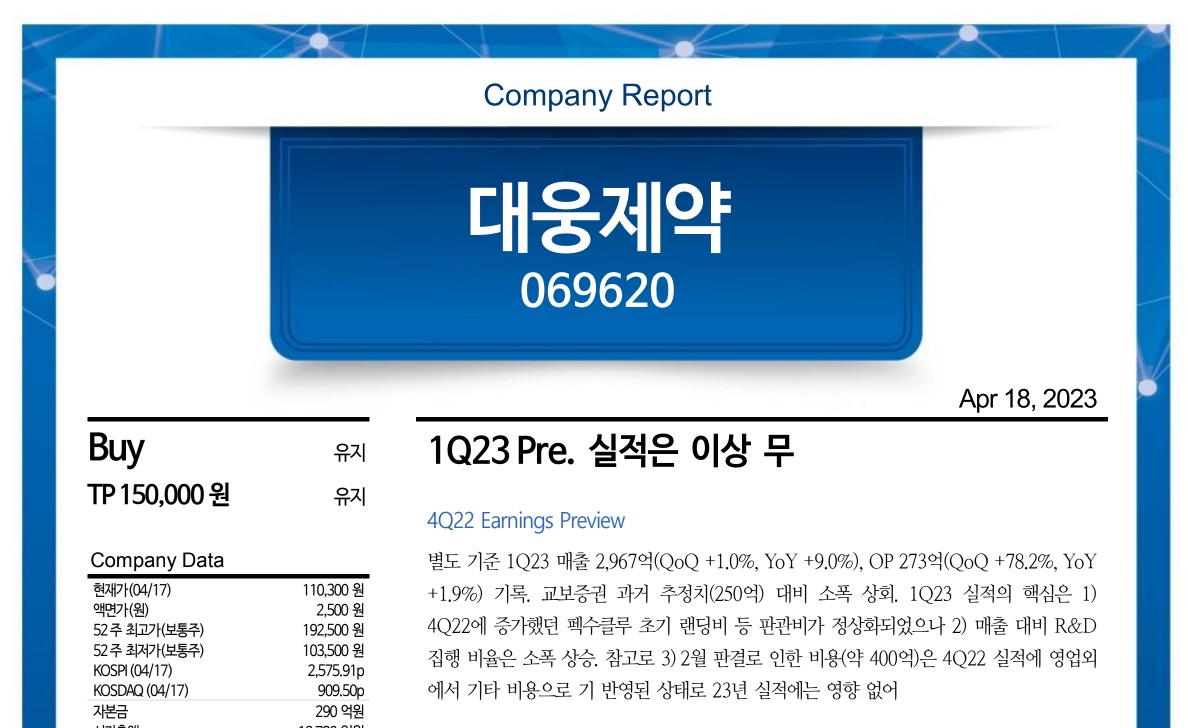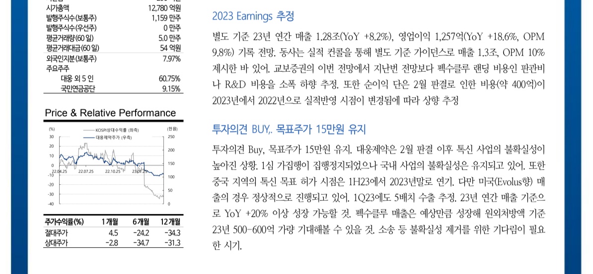 투자의견 매수와 목표주가 150,000원을 유지한다. 대웅제약은 지난 2월 판결 이후 톡신 사업에 대한 불확실성이 커졌다. 1심의 가집행은 중단됐지만 국내 사업의 불확실성은 여전하다. 또한 중국 내 톡신의 목표 승인 기간이 2023년 상반기에서 2023년 말로 연기되었습니다. 그러나 미국(에볼루스로) 판매는 정상적으로 진행되고 있습니다. 23년 1분기 5개 배치 수출 예상. 2023년에는 연간 매출이 전년 대비 20% 이상 성장할 전망이다. 펙수클루는 원외처방 기준 2023년 500~600억원 매출로 예상대로 성장할 전망이다. 소송 등 불확실성 해소를 기다려야 할 때다.