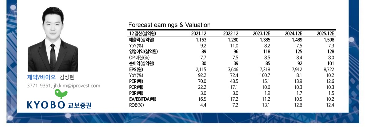 – 별도 기준으로 2023년 매출액은 1조 2,800억원(YoY +8.2%), 영업이익은 1,257억원(YoY +18.6%, OPM 9.8%)으로 예상된다. 어닝콜에서는 매출 1조3000억원, 영업이익률 10%를 별도 가이던스로 제시했다. 교보증권의 전망에서 우리는 Pexuclu 착륙을 위한 판관비와 R&D 비용을 이전 전망보다 소폭 낮췄다. 또한 2월 판결비용(약 400억원)이 실적반영 시점인 2023년에서 2022년으로 변경됨에 따라 순이익 비중이 상향 조정된다.
