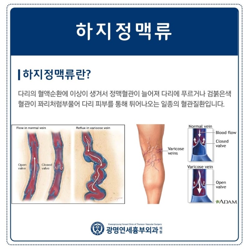 하지정맥류는 하지의 정맥이 구불구불하고 고르지 않게 되는 질환이다. 정맥은 혈액이 심장에서 동맥을 통해 신체의 여러 부분으로 공급되고 다시 심장으로 돌아오는 통로입니다. 정맥에서는 표재정맥, 천공정맥, 표재정맥이 확대되어 외부에서 볼 수 있습니다. 이러한 하지정맥류는 하지의 정맥혈이 비정상적으로 증가하거나 혈관 판막의 기능 이상으로 혈액순환이 잘 되지 않아 심장으로 올라가야 하는 질환이다. 질병으로 인해 혈액이 상승하지 못하고 정체되거나 역류할 때 발생합니다.