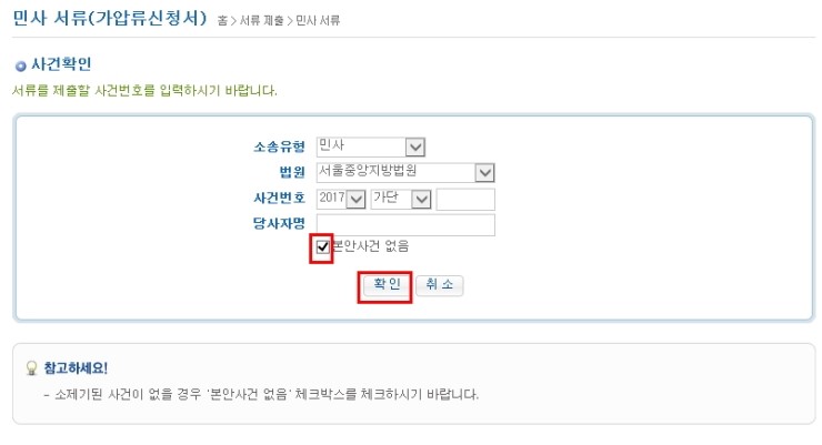 신청서를 클릭하면 사건 확인창이 뜨는데, 이때 주요 사건(사건 접수)이 없을 경우 빨간색으로 표시된 부분에 주요 사건 없음을 체크한 후 확인을 클릭합니다.주요 사건이 있는 경우 소송유형, 법원, 사건번호, 당사자명 입력 후 확인 버튼 클릭