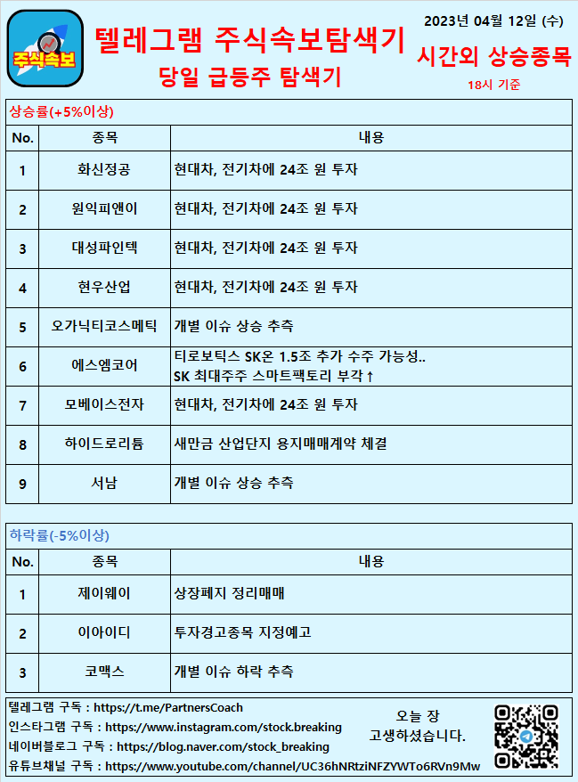 시간외 상승 종목 리스트