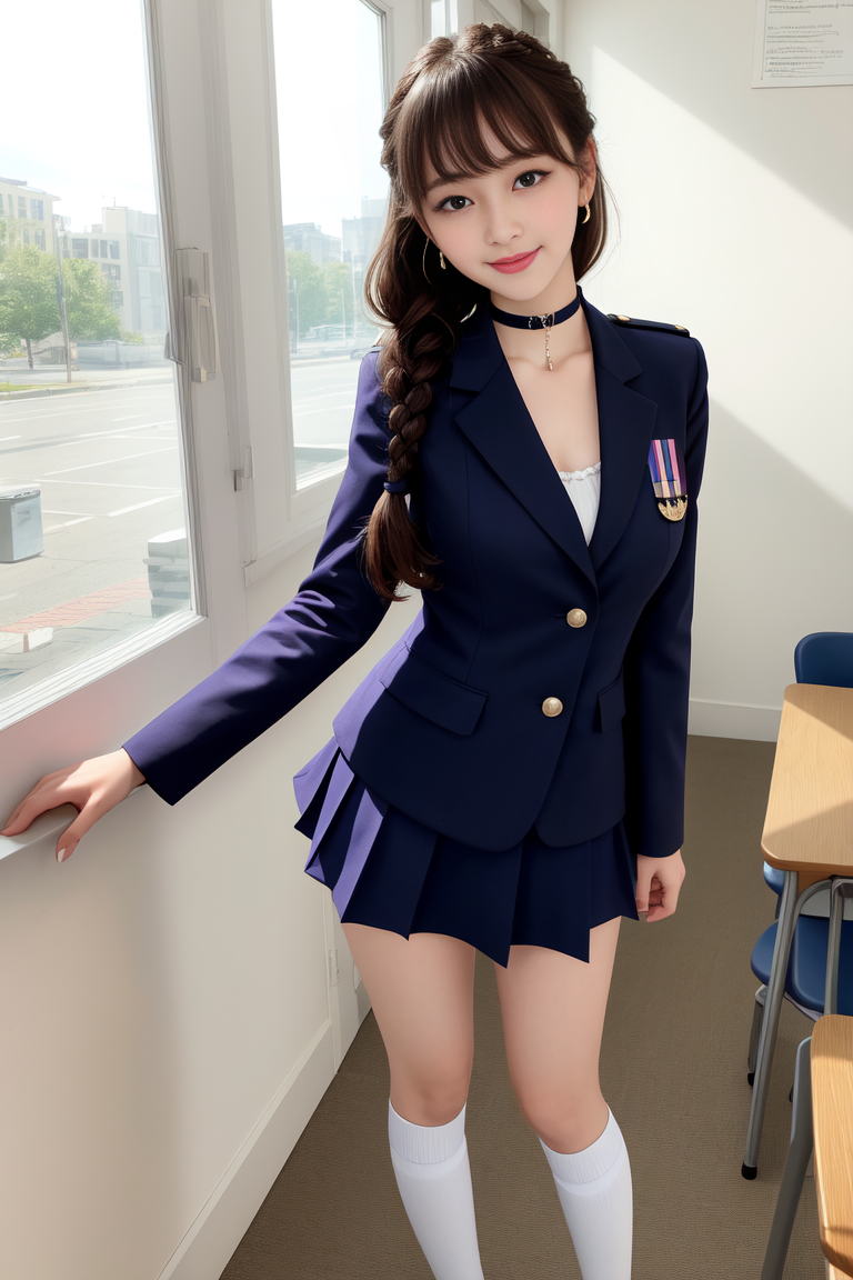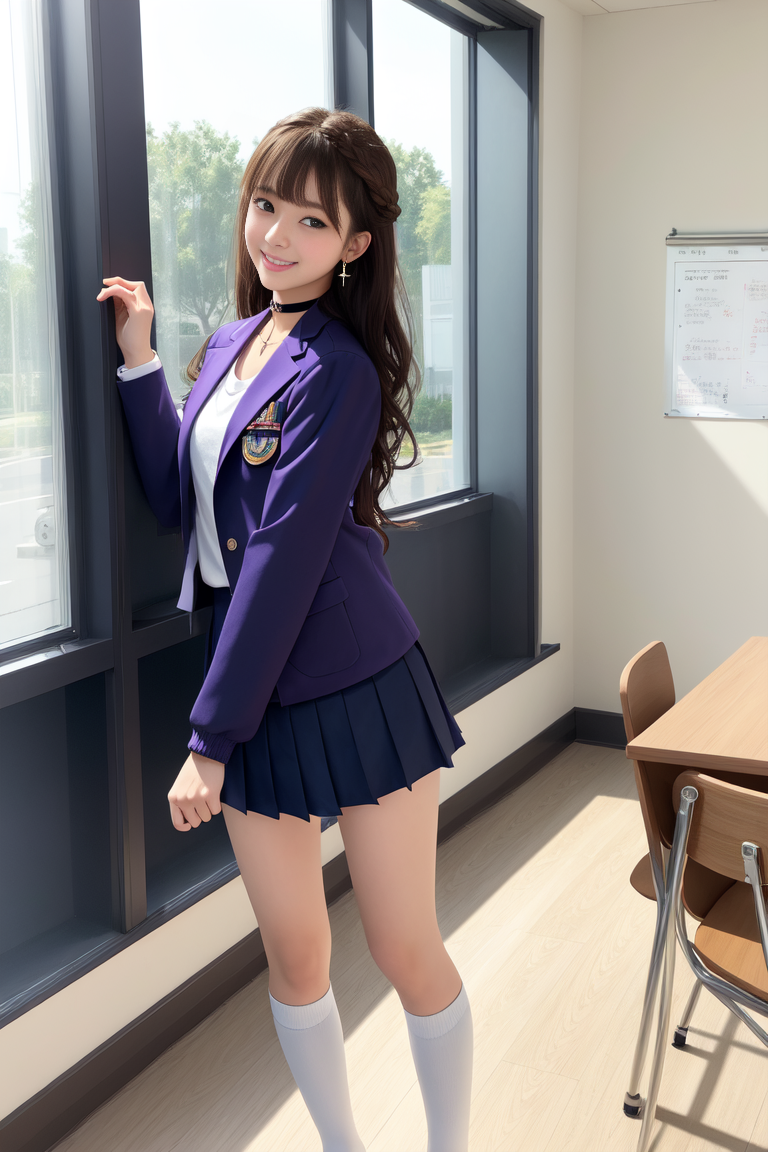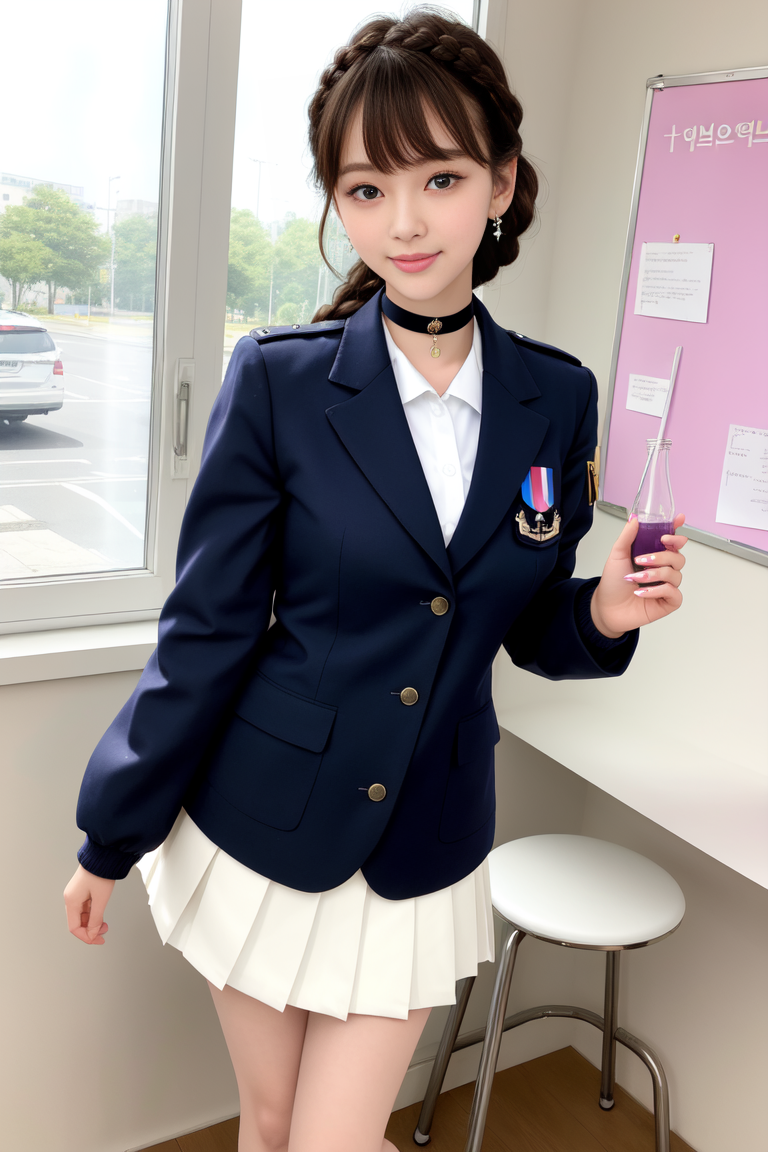 한국에서 온 17세의 아름다운 소녀가 군복을 입고 교실에 들어왔습니다. 그녀는 한국적인 미모와 혼혈 외모를 가지고 있어 K-pop 그룹에서 인기 있는 아이돌입니다. 그녀는 자신의 군복과 어울리는 흰색 셔츠와 보라색 치마를 입고 오픈 재킷 위에 걸치고 검은색 니하이와 로퍼를 신고 교실에 들어섰다.