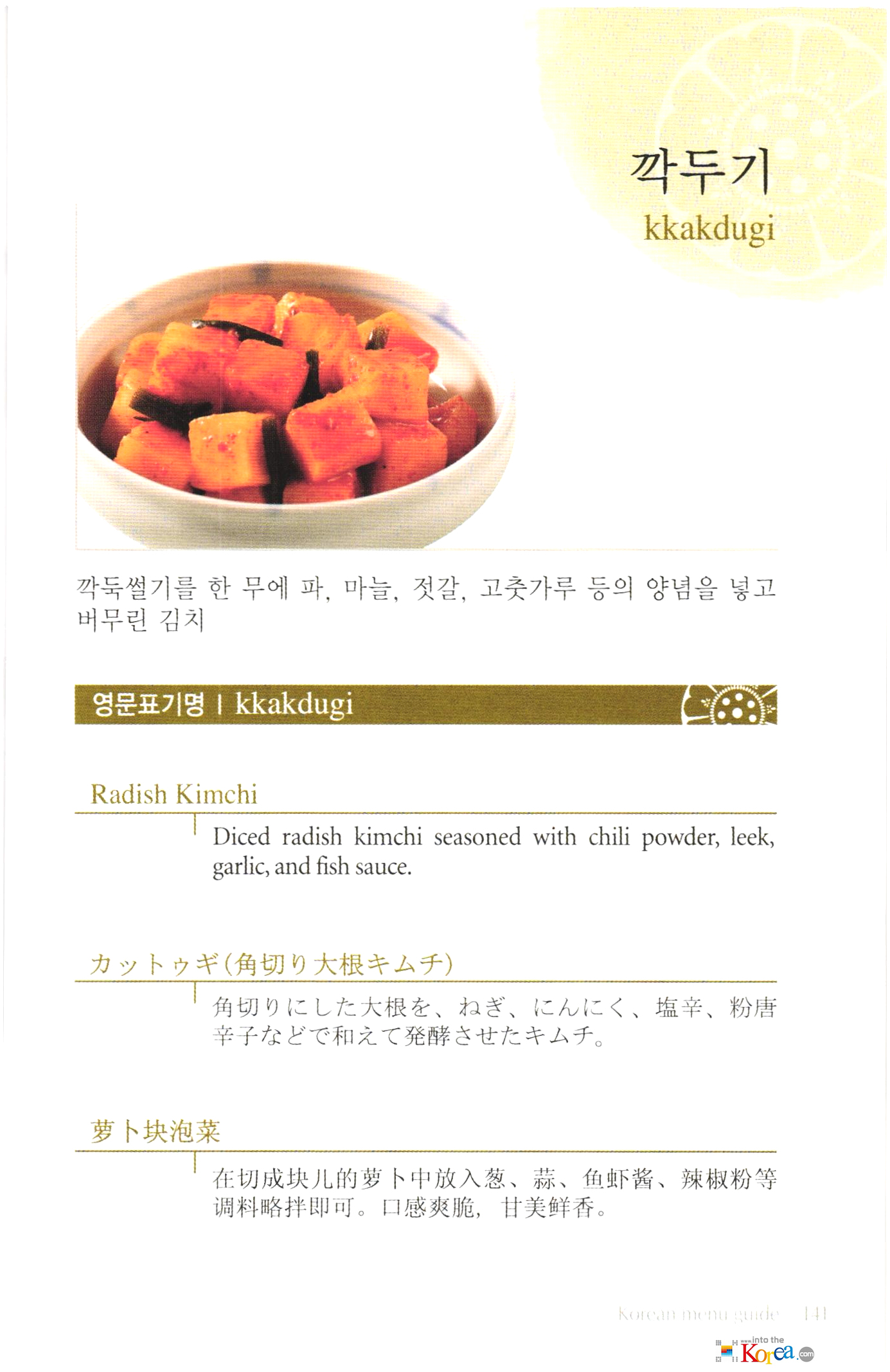 깍두기 : 깍두기는 배추에 다진 마늘, 생강, 고춧가루 등의 양념을 넣고 버무려 만든 발효식품이다. 국민김치라고도 불리며, 한국인의 식탁에서 자주 볼 수 있는 김치 중 하나입니다.