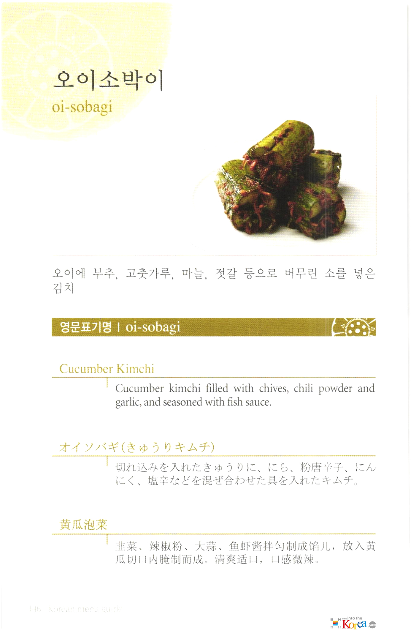 오이소바기 오이소바기는 오이를 썰어 소금에 절인 후 고춧가루, 마늘, 생강 등의 양념에 버무린 김치입니다. 상쾌하고 시원한 맛과 바삭한 식감이 특징입니다.